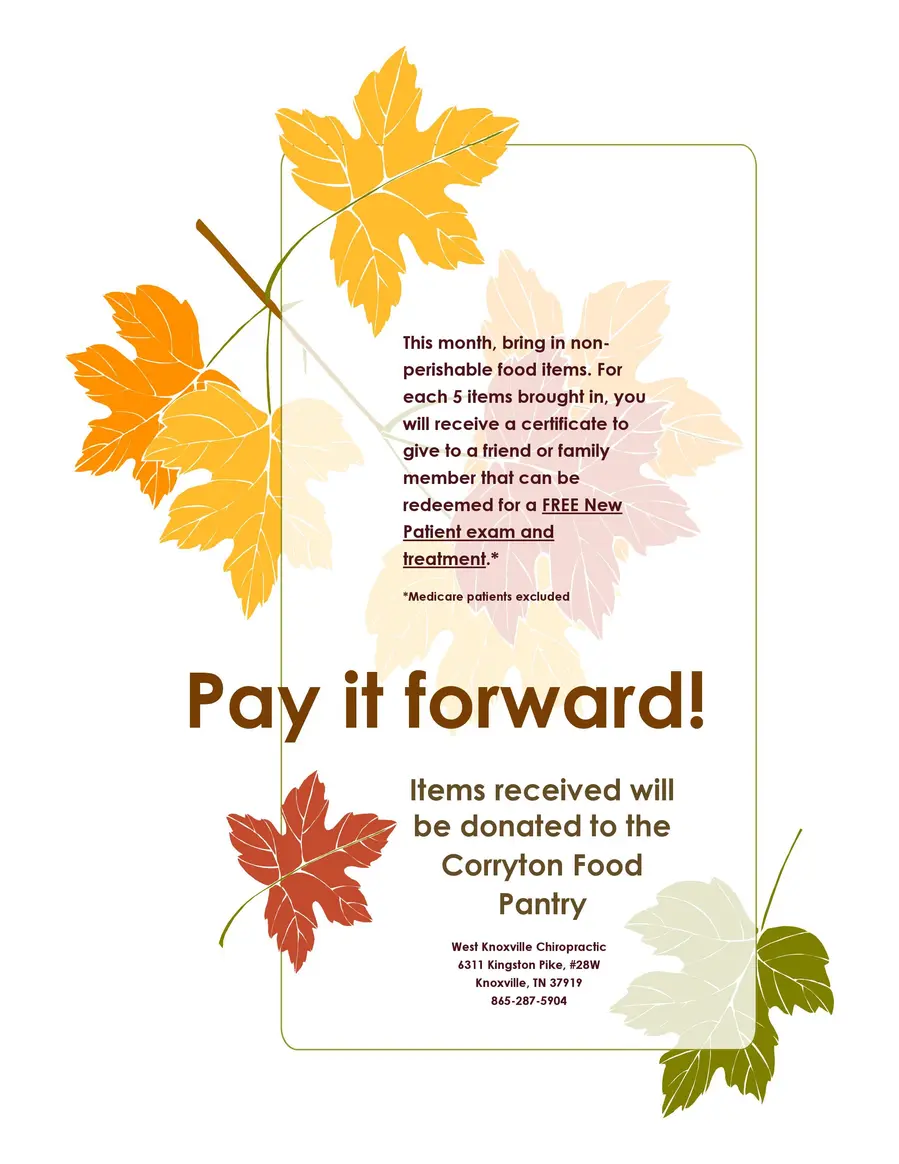 For every 5 items you bring in, you will receive a gift certificate to share with a friend or family member that entitles them to a complimentary New Patient exam and initial treatment. (Medicare patients excluded due to federal regulation.)